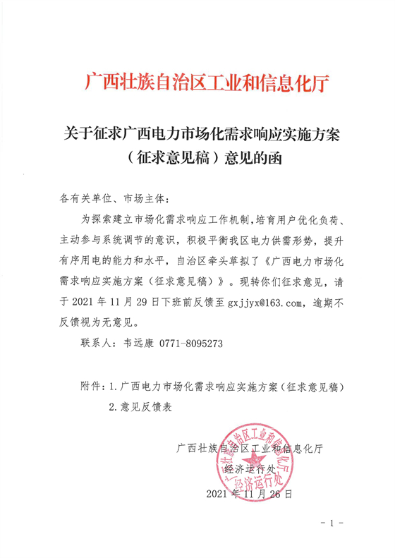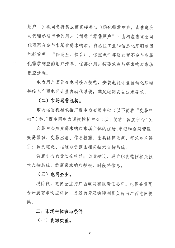 北极星储能网获悉,11月26日,广西工信厅发布《广西电力市场化需求响应实施方案(征求意见稿)》,文件提出,需求响应资源为市场主体可调节负荷,包含自备电源、安装于用户侧的储能装置、具备调节能力的工业生产负荷等。需求响应资源聚合为,以虚拟电厂为单元参与需求响应,参与需求响应报价上限不超过2.5元/kWh。