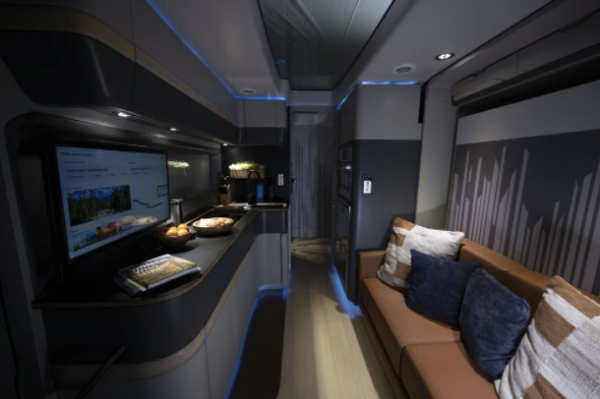 高高的平板风格的触摸屏指挥中心加上了一个alexa支持的语音控制系统,便于操作车载系统,如多媒体和照明。电动电梯上还有一个隐蔽的电视,它集成在司机沙发座对面的长台面中。在上面,长而薄的太阳能电池板侧面有一个天窗,可以让充足的自然光进入。
