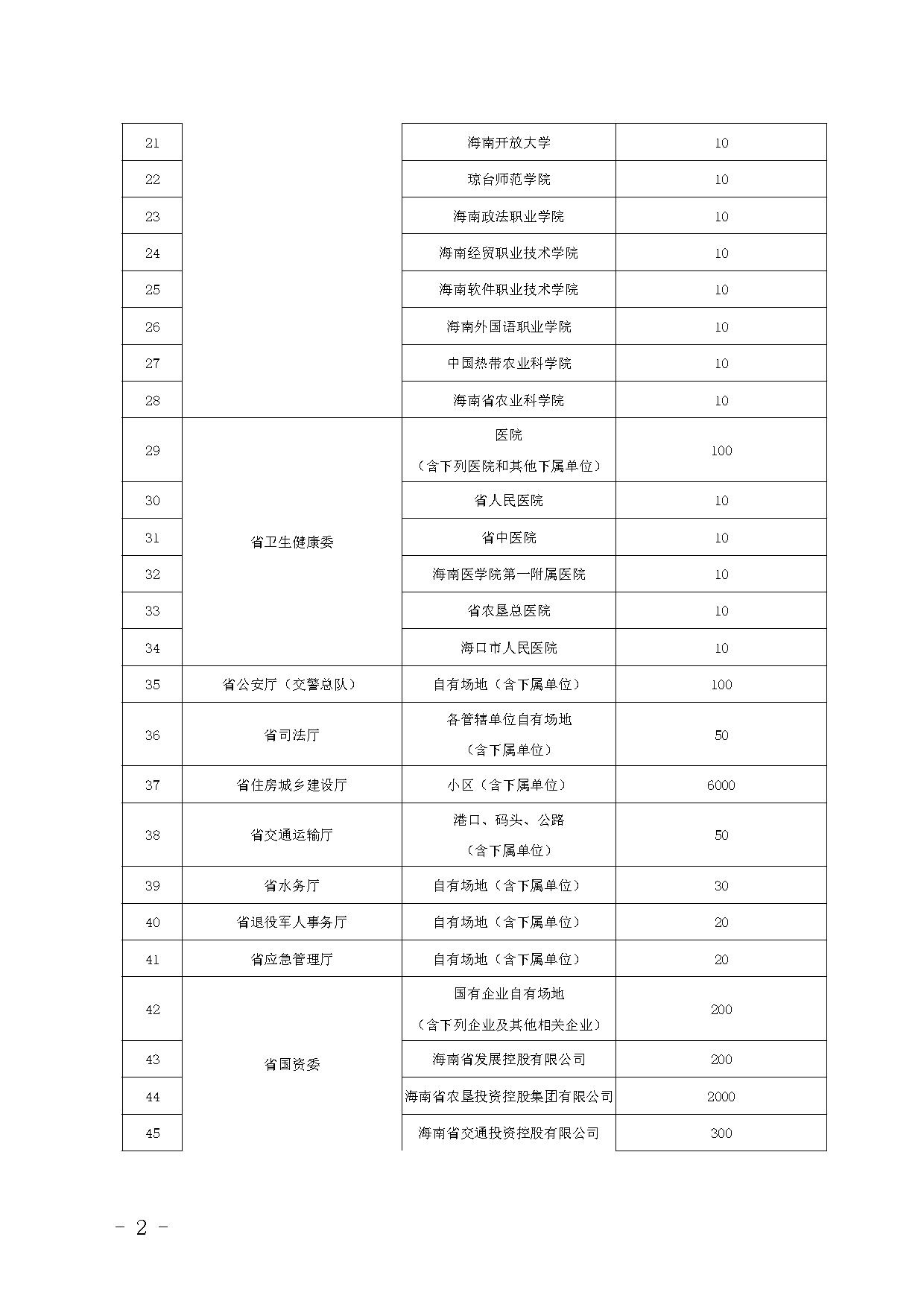 (六)公共经营场所建设任务。2022年,我省有30%的景区景点建设充电设施,其中5A级景区充电设施建设100%全覆盖、4A级景区充电设施建设覆盖60%。全省有50%文体场所建设充电桩。全省有10%规模以上宾馆酒店建设充电桩,其中海口、三亚、琼海、万宁、陵水等热门旅游市县规模以上宾馆酒店充电设施建设覆盖率不低于20%。全省70%二级以上医院建有充电桩。全省有70%以上大学和职业学校建有充电桩。