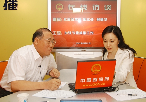 2007年6月22日下午3时,国家发展改革委副主任解振华接受中国政府网专访,就节能减排工作与网民进行在线交流。