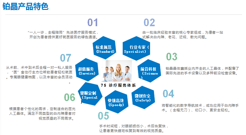 针对铂晶产品的服务优化,普瑞眼科重磅推出7s诊疗服务体系”,个性化定制手术方案、一对一就诊服务、术后终身全国联保、全方位跨学科检查等,给予患者最高端、最贴心的诊疗服务。