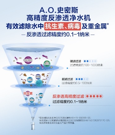 选择安装一台反渗透净水机,来保障家人在此期间的饮用水安全,无疑是一种高效提升饮用水品质的首选方案。反渗透净水机最大的特色在于使用了反渗透膜(RO膜),这是一种高精尖的材料,其过滤孔径仅为约为0.1~1纳米,因此能有效过滤水中的病毒、重金属、抗生素等杂质。针对尺寸仅26纳米的MS2噬菌体病毒进行测试,专利反渗透膜(RO膜)病毒滤除率更是高达99.999%*。因此,一台反渗透净水机可谓是家庭安全必备,尤其是有孕妇和儿童这类特殊人群的家庭,反渗透净水机能有效规避不可预知的突发危机,让饮用水立即变得真正安全。