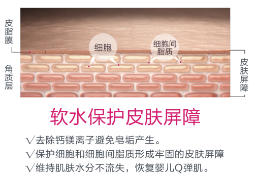 而软水去除了水中的钙镁离子,避免皂垢产生,能够维系皮肤的屏障功能,保证肌肤水分不流失,使皮肤滋润健康。