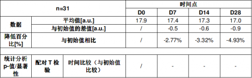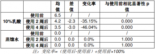 通过以上乳酸刺痛测试结果看出,与初始值相比评分均值均有显著性差异。使用2周,4周后,10%乳酸侧评分均值显著性减小了2.3,3.0;在使用产品2周,4周后,10%乳酸侧评分均值降低了35.15%,46.04%。这说明皮肤的敏感问题得到了有效的改善。