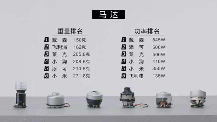 如上图所示,不难看出。戴森吸尘器内置马达是最轻的,但功率却是最高的。市面上大部分的马达都用了铁包裹这样的材质,时间久了总会产生氧化从而影响吸尘器的使用寿命。而戴森采用的酚醛树脂,可以杜绝氧化、生锈的情况。看来戴森的研发部门在这里面下了不少功夫。