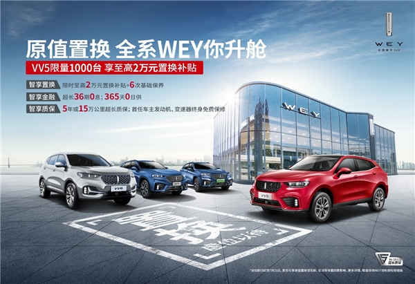 了解到这里,你是否已有所心动了呢?或许已有人开始怀疑自己的预算是否足够。对此我想说,duck不必,我之所以能毫不犹豫地入手VV5,除5年15万公里整车质保,首任车主发动机、变速器终身免费维修的双超质保服务外,还因为它加入了“原值置换,全系WEY你升舱”活动。简单来说,若家中有闲置的长城品牌部分车型(C30)、哈弗品牌部分车型(H1、H2、H4、H5、F5、M6、H6、F7)、WEY品牌全系车型参加这次置换就极为合适,除享受2万置换补贴,还加赠6次基础保养,根据车龄和车况综合考察,有可能实现至高0折旧换购VV5,远远大于市场回收价格。如果你并非以上提到车型的车主,前往置换VV5同样可享受至高1万补贴及6次基础保养。