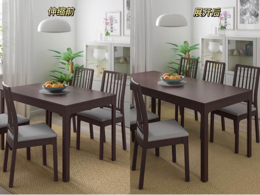 首先,在靠近厨房与客厅连接处,我摆放了一张宜家EKEDALEN伊克多兰伸缩型餐桌。日常自己一个人在家时,它更多承担的是我的工作台的角色,会在上面办公、创作。偶尔也会在上面做做手工,插插花,邀请朋友来家里一起烘焙等等,都会在这张桌子上进行。如果有家人或者朋友来家里做客的话,就会把它的备用活动桌面拉开,原先一米二长度的桌面可以延伸到一米八,容纳8—10个人都不在话下。单手即可操作,非常容易拉开,而且实木材质的桌架使得桌子非常稳定、结实耐用。收起时桌面无接缝,拉伸后桌脚不卡脚,也不妨碍桌子下面摆放椅子。总之是非常灵活多用的空间。