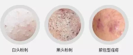 初起为粉刺,有白头粉刺与黑头粉刺两种,内含角质及皮脂。白头粉刺亦称闭合性粉刺,身体受粉刺影响最严重的地区是脸,脖子,胸部,肩膀和背部,这是因为这些区域有很多皮脂腺。这些腺体在皮肤毛囊皮脂产生,这是一种油性物质,起到润滑毛发和皮肤的作用。有时候,过多的皮脂可以堵塞毛孔,为细菌茁壮成长创造了一个理想的环境,从而导致炎症和痤疮的发展。