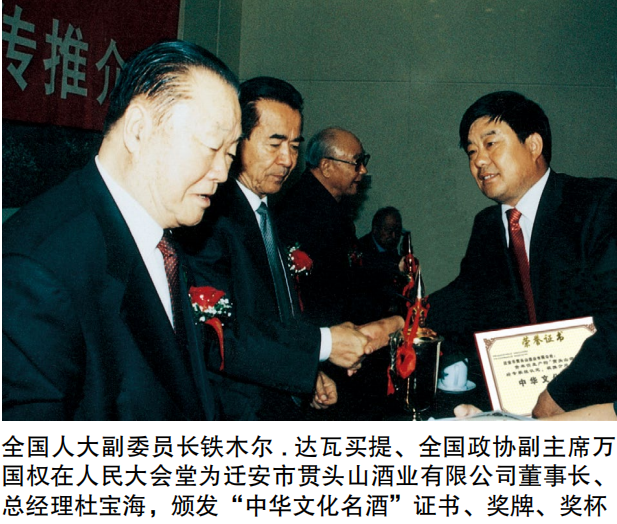 与此同时,杜宝海还始终以“深度挖掘贯头山酒文化底蕴,大力弘扬黄帝文化”为己任,采取“以酒养游,以游促酒”的方式推动企业转型升级、综合发展。为此,他投巨资修建了贯头山酒文化园,设立了黄帝圣像及黄帝祖庭馆,建立了河北省第一家酒文化博物馆,还对魏晋时期的千年古泉和古井亭进行了有效保护。此外,杜宝海还依据大量历史资料,主持修建了百米诗酒文化长廊,展出了描绘迁安白酒发展史及典故传说的三十四幅浮雕,让人们从厚重的贯头山酒文化中了解迁安的历史,真正把企业打造成了集研发,生产,销售,品酒,休闲,娱乐,旅游为一体的综合型企业,并于2007年1月斩获了“全国工业旅游示范点”的殊荣。