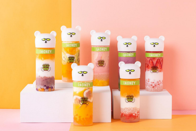 以“IHONEY”的明星主推“熊宝摇摇甘露系列”为例,金香软滑的甘露加入淡花奶鲜榨的芒果汁,丝滑如绸,如久旱逢甘露般沁爽,再搭配上传统甜品“金川烧”,味道浓郁,回味悠长,鲜奶+鲜奶的绝美组合,绝对是店铺招牌饮品。