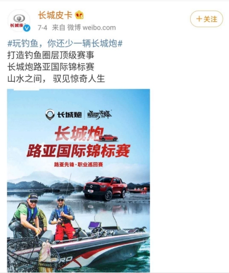 就目前路透的赛事预告来看,这场赛事的“钓法”让我十分感兴趣,我参与垂钓俱乐部三年时间,还没见过坐车在水里钓鱼的,长城炮越野皮卡真是让我长见识了。但听一起钓鱼的朋友科普,这辆长城炮越野皮卡配备了涉水喉,能在700mm深的水域自由行驶,可以代替路亚艇站在长城炮的货箱里钓鱼。还能拖船,装载,完美契合路亚高端钓鱼运动的特殊需求,属实挺给力。目前,长城皮卡还发起了#玩皮卡,你还少一辆长城炮#微博话题,欲知更多关于赛事和长城炮的秘密,大家可以点这里。