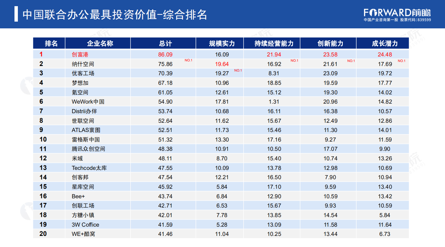 每个行业都不乏有黑马,联合办公行业同样如此。据前瞻研究院5月发布的《2020年中国联合办公最具投资价值企业榜》显示,创富港、纳什空间、优客工场位列前三。当中,创富港在持续经营能力、创新能力、成长潜力方面遥遥领先行业。