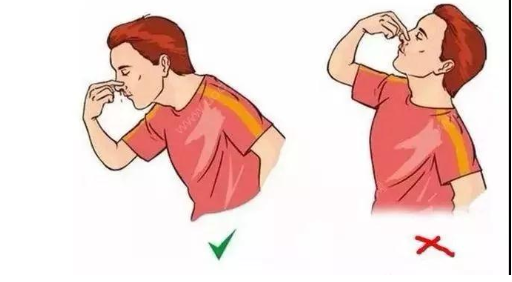 保持正常直立或稍向前倾的姿势,然后用手指压住双侧鼻翼持续5-10分钟,然后放松按压,查看是否已经止血。用沾了水的湿棉球塞进流血的鼻孔,然后再按压,也有助于止血。