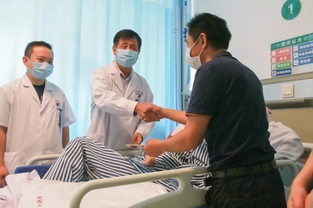 小唐即将出院,小唐爸妈开心地与医护人员合影