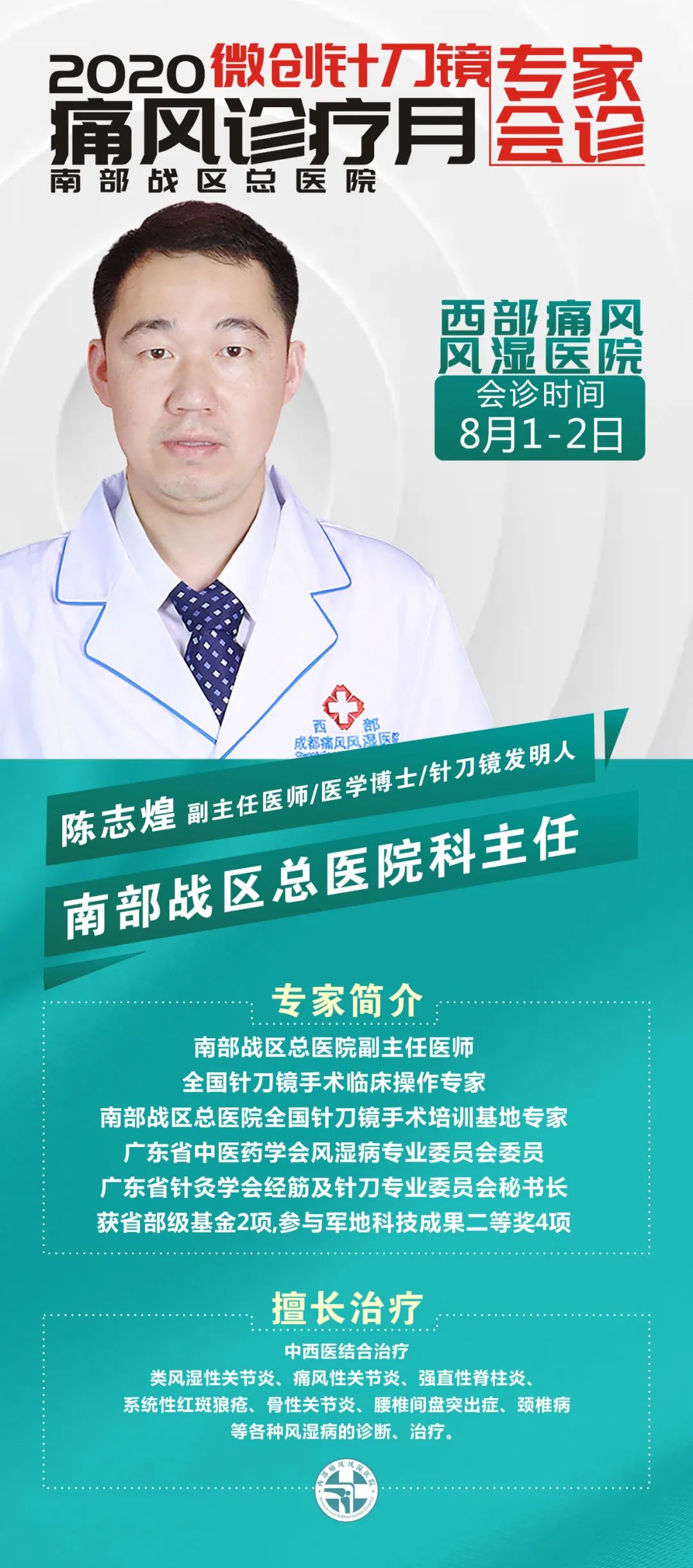 届时,来自【北京协和医学院风湿免疫联合诊疗中心】【四川省人民医院】【成都西部痛风风湿医院】等医院的风湿骨病专家们都将汇聚我院,与针刀镜发明人陈志煌教授就微创可视针刀镜的临床应用进行深度的技术交流,进一步促进该技术在行业内的学术分享、讨论、研究。