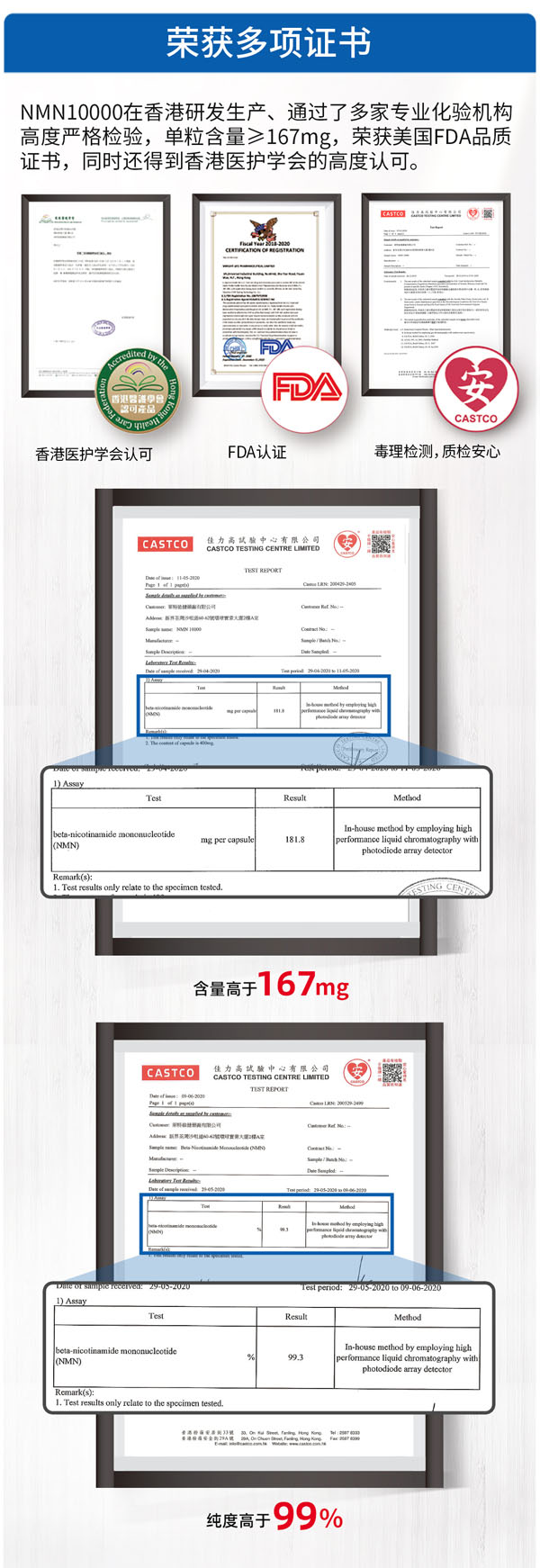 香港莱特维健NMN携手多位科研专家同时将国外多项前沿科研成果结合,将NMN转化为寻常百姓都可享用的的产品。使抵抗衰老不再是富人的专享。其中1粒167mgNMN胶囊相当于40—280公斤牛肉中NMN的含量,可以有效的提高人们体内NMN的含量。尤其是熬夜失眠人群的福音。莱特维健NMN10000通过了多家专业化验机构高度严格检验,荣获美国FDA品质证书,质量方面有严格的保证。