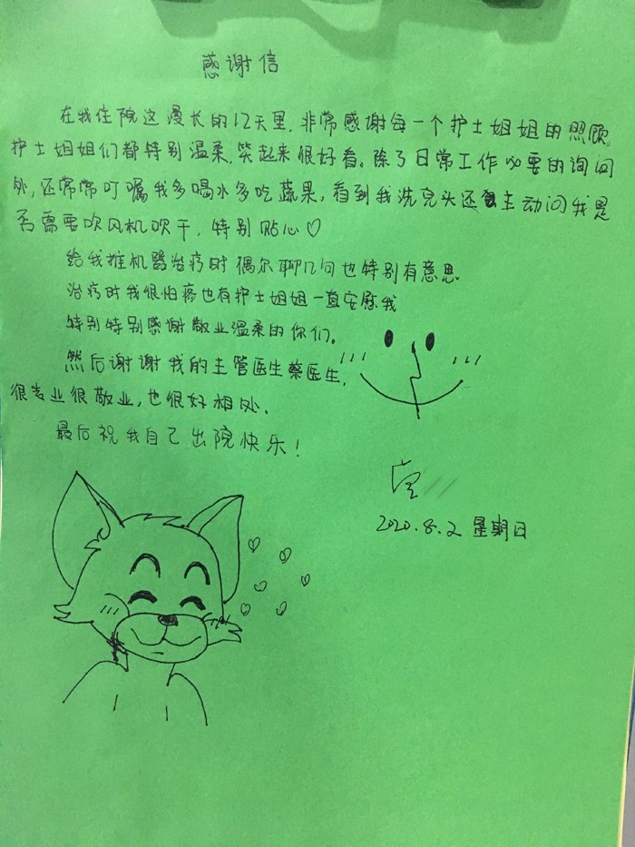 给我推机器(做)治疗时,偶尔聊几句也特别有意思。治疗时我怕疼,也有护士姐姐一直安慰我。特别感谢敬业温柔的你们,然后谢谢我的主管医生蔡医生,很专业很敬业,也很好相处,最后祝我自己出院快乐! 患者小曾,写于8月1日。