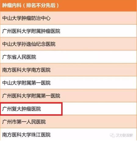 其中内科、肿瘤科系列共评出心血管内科、呼吸内科、消化内科、神经内科、肿瘤内科、肿瘤放疗科等12个专科榜单,共计110个上榜科室,来自25家医院。在肿瘤内科榜单中,中山大学肿瘤防治中心、中山大学孙逸仙纪念医院、中山大学附属第一医院以及广东省人民医院均上榜,其中,暨南大学附属广州复大肿瘤医院排名第八位,仅次于广州医科大学附属第一医院,是该榜单中唯一一家上榜的民营医院。