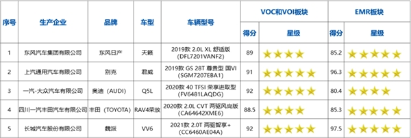 除了智慧健康座舱认证,在健康方面,2021款VV6还获得了中国汽研的“车内健康指数”双五星认证,主要包括车内挥发性有机物(VOC)、车内气味强度(VOI)、电磁辐射(EMR)三个评价项。
