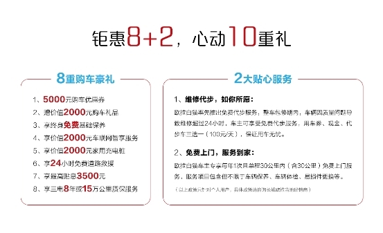 除了优越的性能帮助节省用车成本,欧拉白猫还有多重福利加码,进一步减轻我们的购车成本。我们去天猫长城汽车官方旗舰店购买欧拉白猫,就能够享受8重购车豪礼+2大贴心服务:用户支付9.9元意向金即可到手5000元购车优惠券,并获赠价值2000元的购车礼品;前300名支付2000元大额定金的用户,还能与意向金权益叠加再享6重豪礼。2大贴心服务包括:率先升级的维修补偿服务,以及贴心周到的免费上门服务,不得不说,这样的豪华大礼包,属实够贴心!