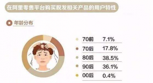 近年来脱发成为热议话题,刷爆网络,尤其是90后,他们吐槽自己提前加入了“保卫头发大军”,成为了各种防脱洗发水、生发液的忠实用户。阿里巴巴发布《拯救脱发趣味白皮书》,通过健康大数据分析可以得出结论:脱发人群正趋于年轻化,通过在网络上购买生发产品的顾客群可以看出,90后群体占了近四成。