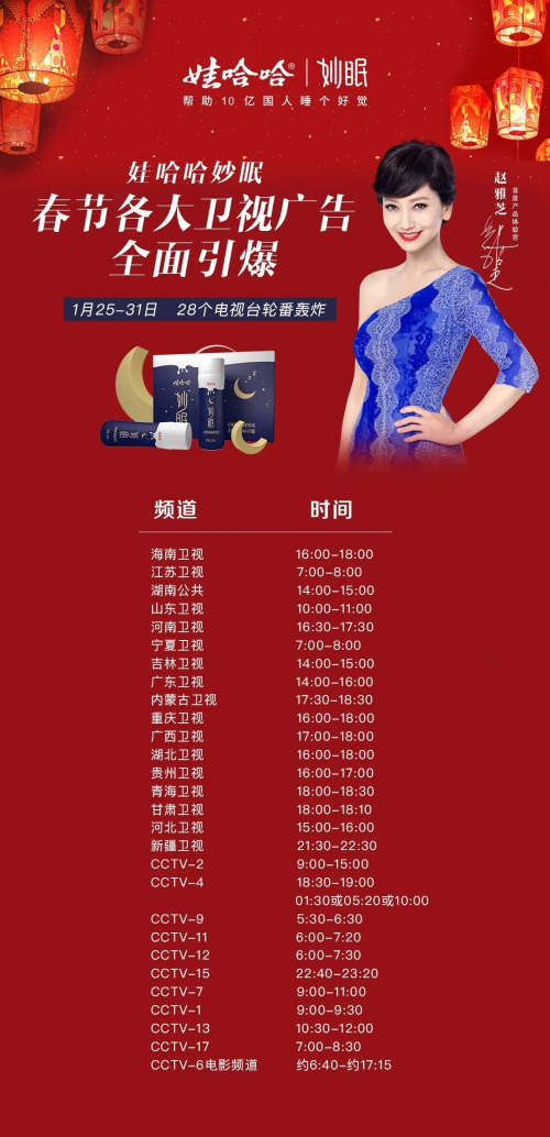 由国民不老女神赵雅芝拍摄的娃哈哈妙眠广告宣传片,在各大卫视广告全面引爆,30多家电视台轮番轰炸,CCTV-1、CCTV-2、山东卫视、吉林卫视等央媒、省媒纷纷聚焦娃哈哈妙眠:睡觉前、喝妙眠。