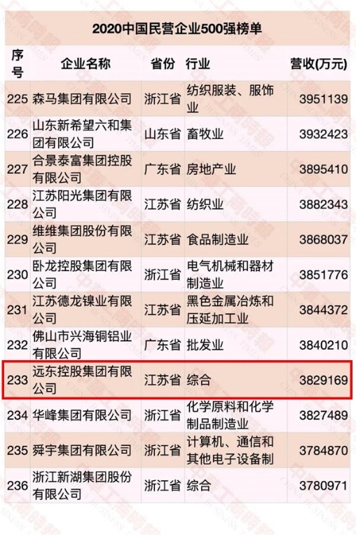 2020中国民营企业500强榜单发布!远东控股集团位列233位