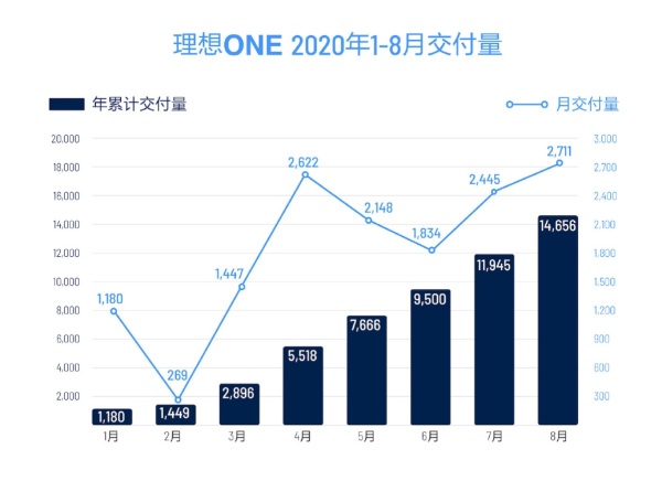 9月2日,理想汽车公布了8月交付数据。理想ONE在8月交付2711辆,创单月交付量新高。2020年1-8月,理想ONE总计交付14656辆。