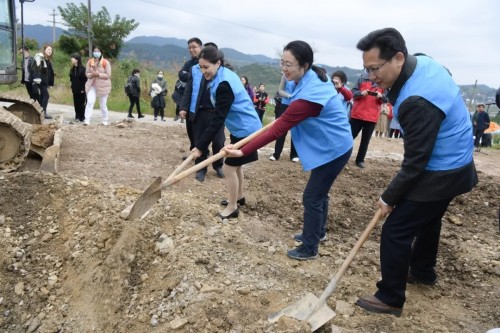 中国妇女发展基金会助理秘书长南静(中),国家审计署挂职丹寨县委副书记、副县长周俊(右一),日出东方公益慈善委员会主席吴典华(左一)等领导为四季沐歌马寨村母亲水窖项目开工培土奠基