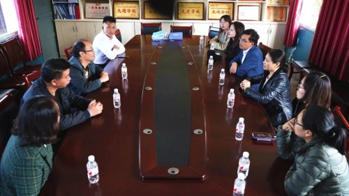 日出东方公益慈善委员会主席吴典华、四季沐歌集团品牌总监李文平等与马寨小学校领导进行项目沟通