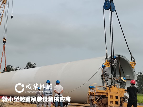 风力发电机体积非常大,无法进行整机运输作业,到达安装地点后,需要将配件进行组装,将主轴固定好,大型的叶片、中轴等,使用大型起重机械进行吊装,小型的锁扣、轴承、支撑杆等配件,使用手拉葫芦吊装。