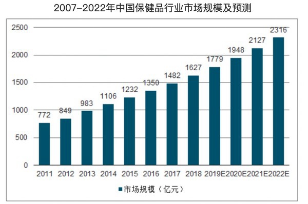 大健康行业市场容量大。根据《2020-2026年中国膳食营养补充剂行业市场前景规划及市场前景趋势分析报告》数据显示:2019年中国消费健康行业零售规模为2807亿元,其中膳食补充剂市场零售规模为1621亿元,占消费健康行业的58%。而目前发达国家每年人均消费100美元,中国人均不到20美元,未来还有5-6倍提升空间。