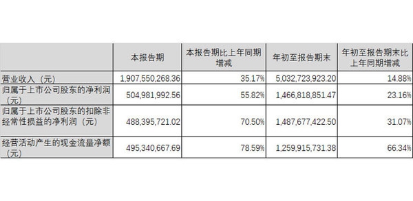 财报显示,公司前三季度净利润14.67亿元,同比增长23.16%。其中第三季度实现归母净利5.05亿元,同比增长55.82%。