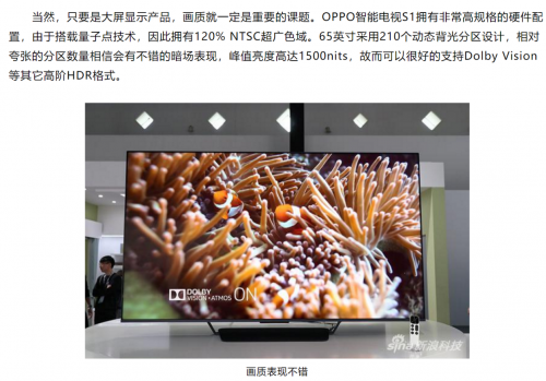 @新浪科技 则直接用“影音体验超预期”来表现对OPPO智能电视S1画质的充分肯定。此外,新浪科技还在强调其屏幕“拥有非常高规格的硬件配置”,拥有“QLED量子点屏幕”、“采用210个动态分区设计”,以及“相对夸张的分区数量”。可见,一块好的屏幕,强劲的硬件基底是基础,毕竟远离配置谈体验颇似“耍流氓”。