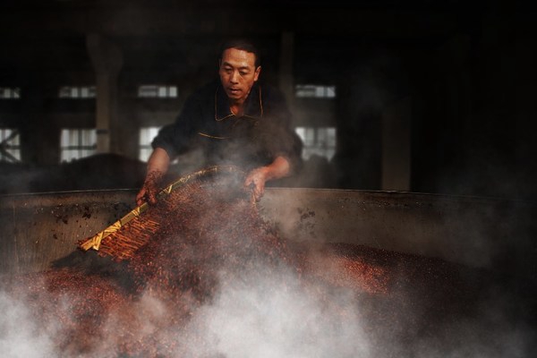 将水烧至95度以上,浸润新收获的糯红高粱,用箢篼将高粱上甑蒸煮,见气压醅;待蒸煮后,迅速摊晾,糖化发酵,等待入窖发酵……下沙的每一个环节,是酿酒师们日以继夜的匠心传承。