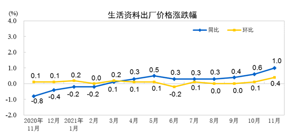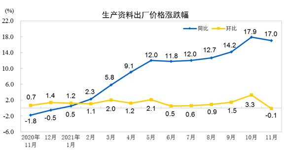 2021年11月份,全国工业生产者出厂价格同比上涨12.9%,环比持平;工业生产者购进价格同比上涨17.4%,环比上涨1.0%。1—11月平均,工业生产者出厂价格比去年同期上涨7.9%,工业生产者购进价格上涨10.7%。