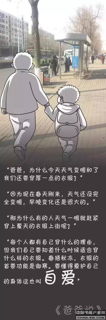 “爸爸,为什么今天天气变暖和了我们还要穿厚一点的衣服?” “因为现在春天刚来,天气还没完全变暖,早晚变化还是很大的。” “那为什么有的人天气一暖就赶紧穿上夏天的衣服上街呢?” “每个人都有自己穿什么的理由,但我们自己要知道什么时候适合穿什么样的衣服。春捂秋冻,衣服的首要功能是御寒。要懂得爱护自己的身体这也叫自爱。”——自爱