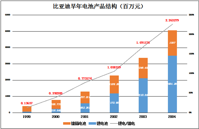 2002年7月,比亚迪在香港主板上市(代码01211.HK),募集资金16亿港元。上市后,锂离子电池出货量把镍镉电池远远抛在后面,1999年锂离子电池销售额仅为镍镉电池的14%,2004年达到226%。
