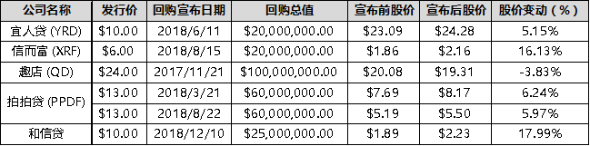 从市场反应来看,股票回购对于提振股价往往有着“立竿见影”的效果。数据显示,除趣店外市场对于回购案均给予了不同程度的积极信号。其中和信贷此前受Q3财报影响跌幅较大,在宣布回购案后市场情绪反弹最为明显,宣布后股价收盘上涨17.99%。