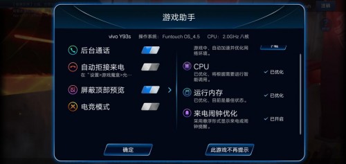 除了在常用功能上全面升级之外vivo为Y93s还配备了专业的游戏模式——游戏魔盒vivo Game