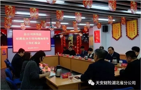 1月30日,总公司领导洪伟赴分片包干挂钩联系机构湖北省分公司调研督导业务发展。31日上午,洪伟总听取了湖北省分公司班子成员和管理部门负责人的工作汇报,并与相关部门负责人进行了座谈交流。其中,车险部经理毛艳做了关于湖北省分公司车险业务经营发展情况的专题汇报。