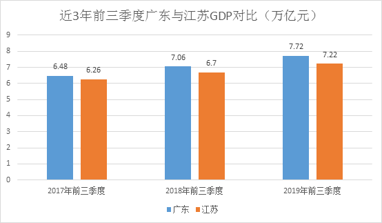 不过从近三年两省份前三季度的GDP来看,江苏追赶广东但差距略有扩大,从2017年前三季度江苏落后于广东0.22万亿元拉大到去年的0.36万亿元。今年前三季度,广东超越江苏0.50万亿元。