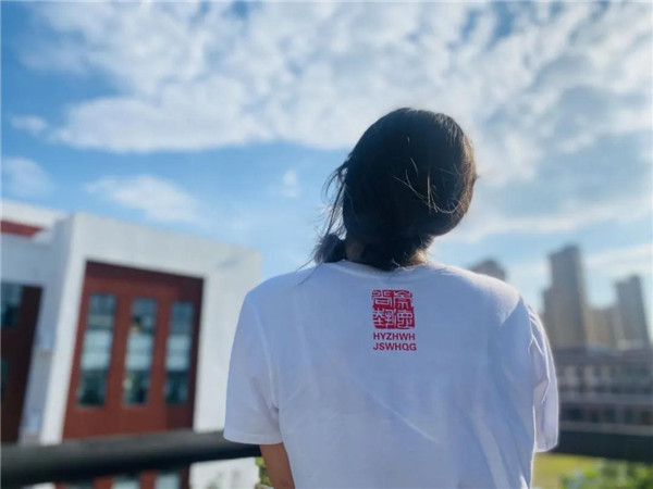 这款文化衫正面用中国红的色彩印制着河南省工艺美术大师、王氏刀书画非遗传承人王濮方的代表作品“善”字,背面印制有由齐(白石)派篆刻传人刘国亮精心创作的“崇德尚艺”篆刻印章,并搭配着“弘扬中华文化,建设文化强国”的首字母,左袖头印有“王氏刀书画”和“中国濮阳”的专属印记,设计范十足而且寓意深刻。