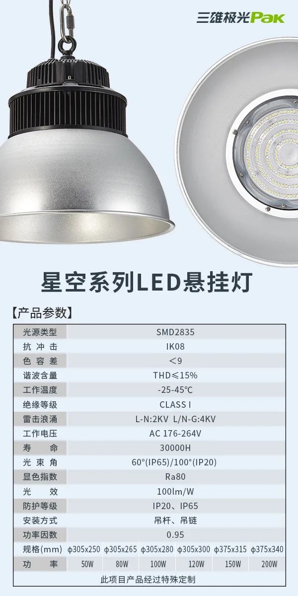 功率大。星空系列LED悬挂灯目前具有6种规格,最大功率能做到200W。从顶棚高度与设计照度方面考虑,可以在保证充足的照度下,适当增加灯具距离,减少灯具使用。