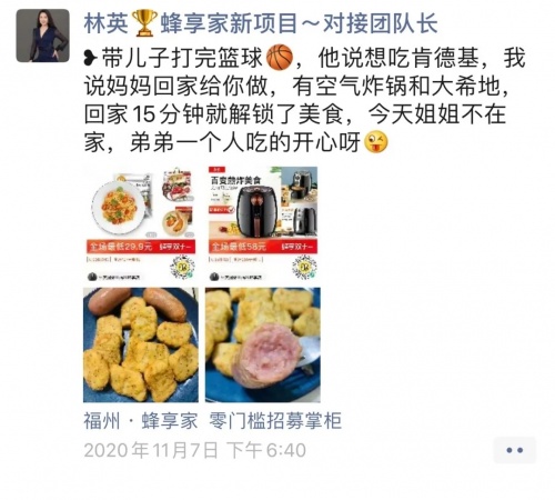 传统电商平台,如果要打爆款,需要投广告、直通车、 请明星代言等引流手段。私域电商比较强的方式是先去体验 ,在蜂享家,很多商品在售卖前,可能都要长达一周、两周甚至一个月的种草时间,大量的用户体验产生大量生活素材,比如说平台之前售卖一款空气炸锅,社群中掌柜们不是在讲炸锅的功能,而是去制作薯条、鸡翅等各种生活相关的东西,然后晒出自己或者孩子吃东西的图片或视频,把商品特性植入场景。