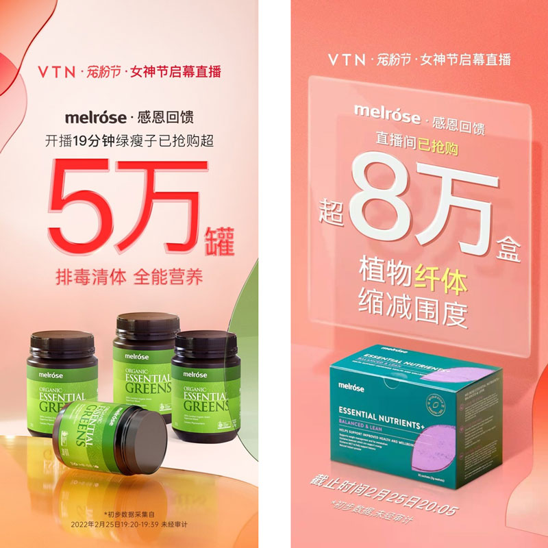 2月25日晚七点,在Melrose麦萝氏VTN宠粉节.女神节启幕直播中,Melrose旗下主打产品Melrose绿植精粹粉(绿瘦子)开播19分钟已抢购超50000罐!