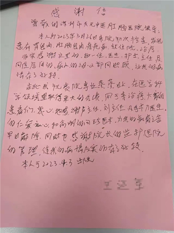 为医者仁心点赞!深圳天元中医肛肠医院收到患者感谢信