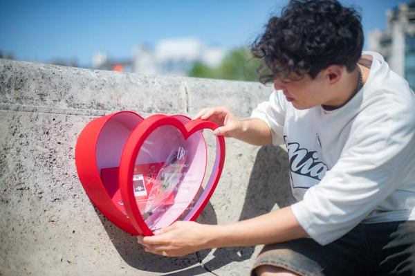 这个应急玫瑰装置无论是放在哪个街头,都是非常亮眼的存在。代表爱情元素的心形红色外观远远望去就能被抓住眼球,让不少路人纷纷前往一探究竟。