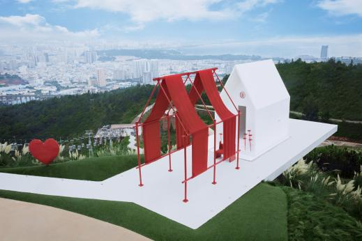 此外,在大理云想山,DR 以脚⼿架为框架,红线为饰⾯,搭建出⼀座悬崖上的半露天红⾊礼堂,毗邻花海,眺望洱海,成了观赏日落夜景的打卡圣地,堪称阿那亚礼堂“贵替”。