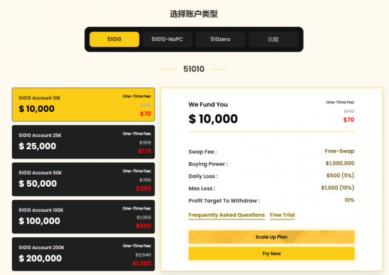 选择适合自己的套餐如果您是新手交易员,我们建议您选择“挑战账户”,只需完成“交易技能”和“稳定性评估”两阶段考核,即可获得10000美元起的训练账户(2026新年优惠活动,套餐费用仅需:45美元),还有机会获得高达90%的交易绩效分成。有经验的交易员选择“即时账户”,省去考核时间,直接开启训练,您仅需支付70美元起(不同的活动,价格有所差异,请以官网实时价格为准),就能获得一个10000美元起的训练账户。